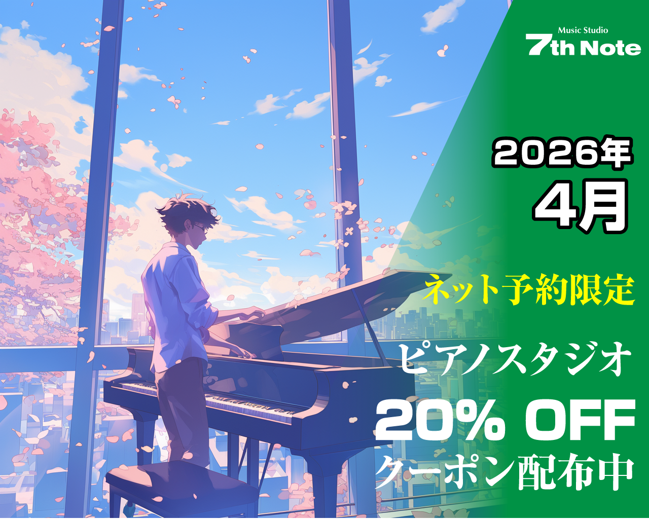 2026年4月限定 ピアノスタジオ 20% OFF 2026/03/25 7thnote 土日祝も含め10:00〜23:00のご利用が20% OFFになります ネット予約時にクーポンコードを入力してください(電話や店頭での予約ではご利用いただけません) クーポンコード:749818 長時間割引等、他の割引とは併用できません(割引率の多い方だけが適用されます) 適用期間:4月1日10時 〜 4月30日23時