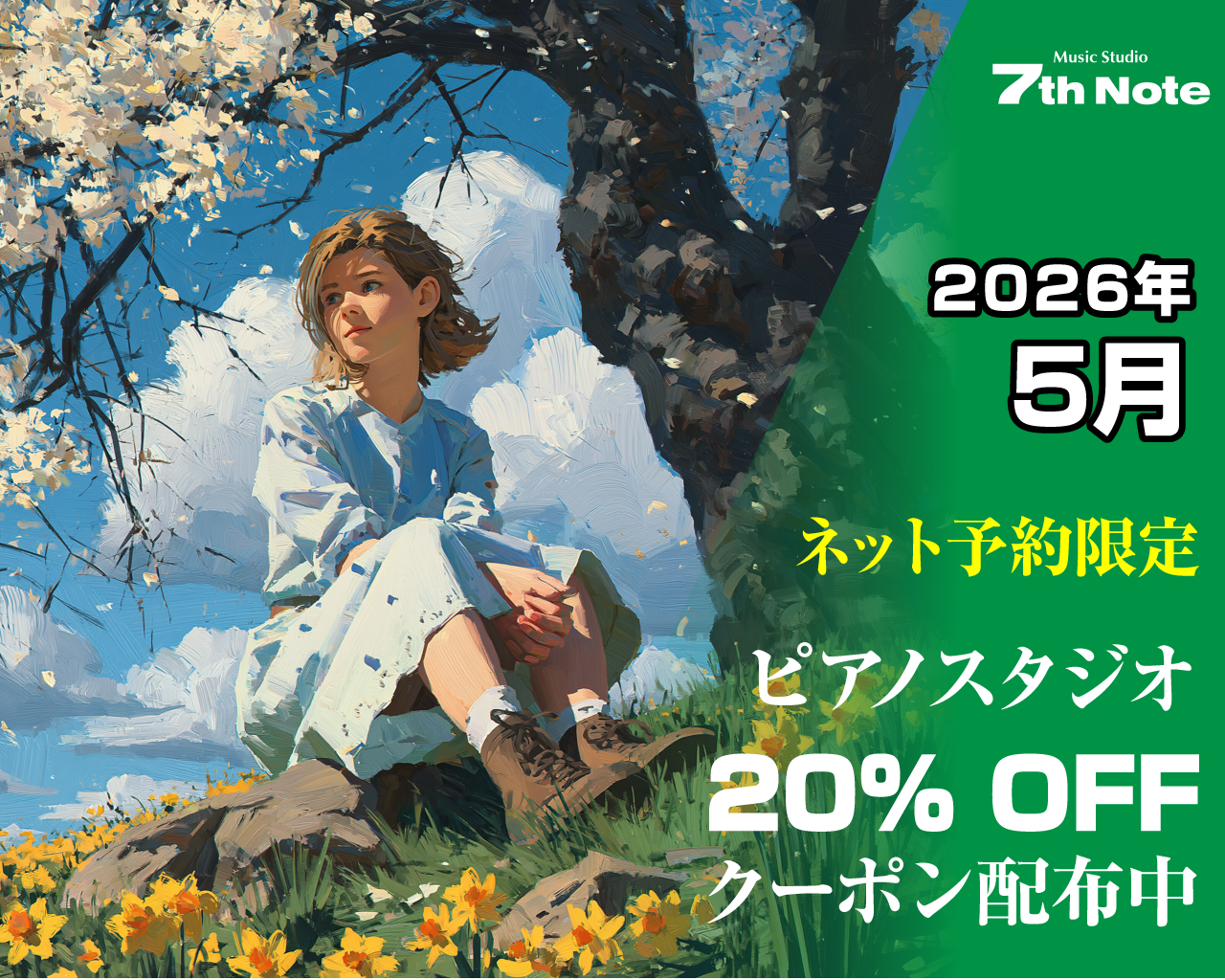 2026年5月限定 ピアノスタジオ 20% OFF 2026/04/18 7thnote 土日祝も含め10:00〜23:00のご利用が20% OFFになります ネット予約時にクーポンコードを入力してください(電話や店頭での予約ではご利用いただけません) クーポンコード:831029 長時間割引等、他の割引とは併用できません(割引率の多い方だけが適用されます) 適用期間:5月1日10:00 ~ 5月31日23:00